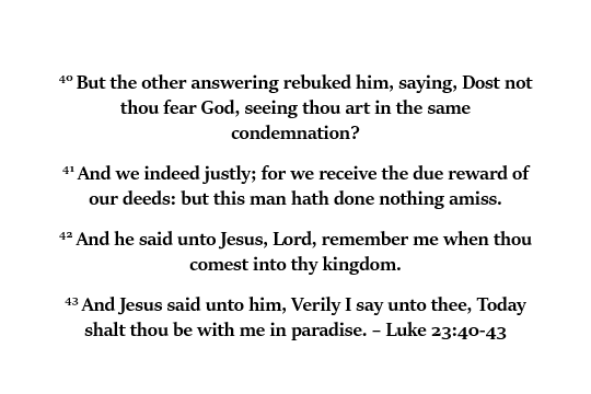 40 But the other answering rebuked him, saying, Dost not thou fear God, seeing thou art in the same condemnation? 41 And we indeed justly; for we receive the due reward of our deeds: but this man hath done nothing amiss. 42 And he said unto Jesus, Lord, remember me when thou comest into thy kingdom. 43 And JesusContinue reading “Remember Me When You Come into Your Kingdom”